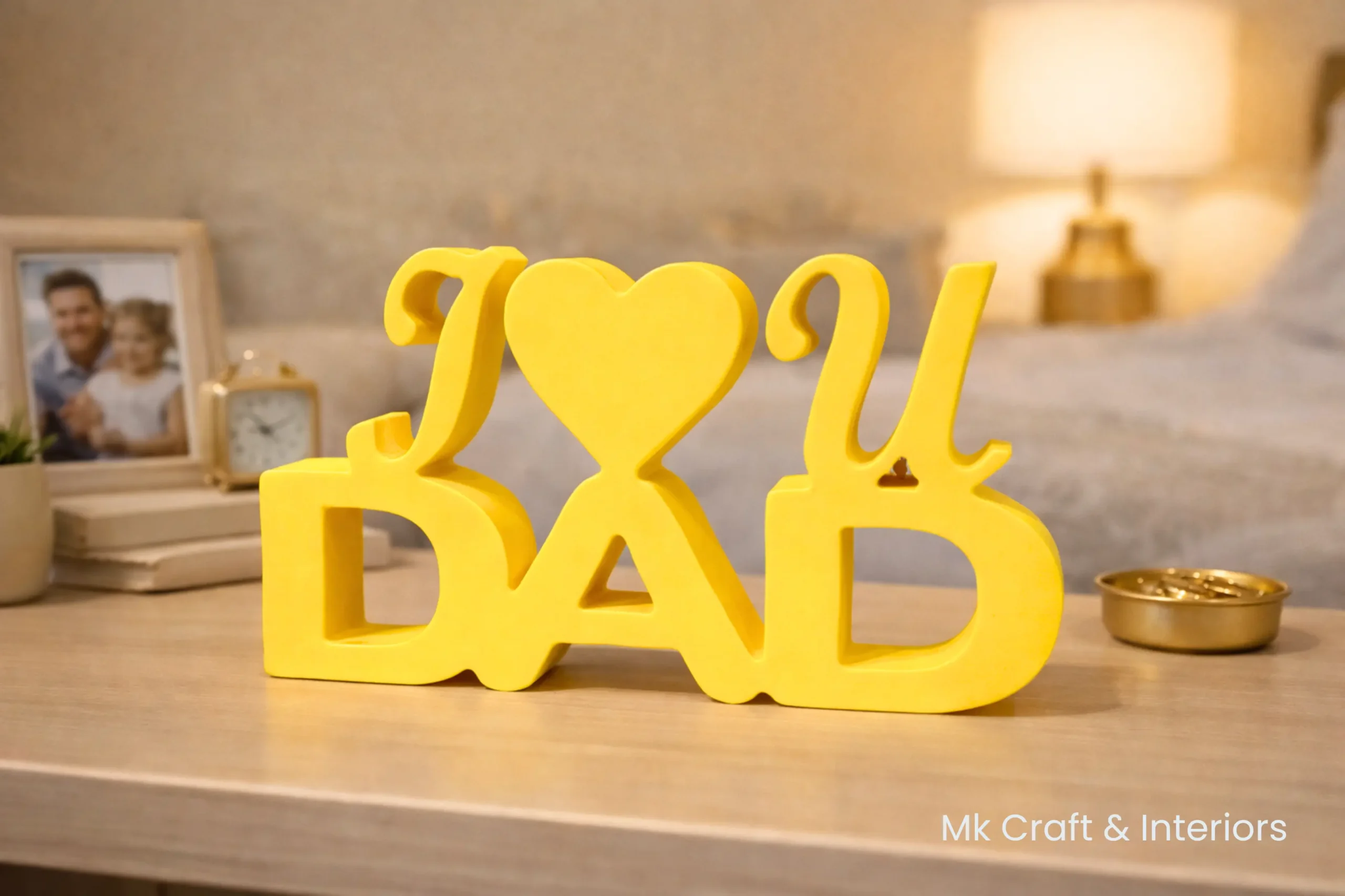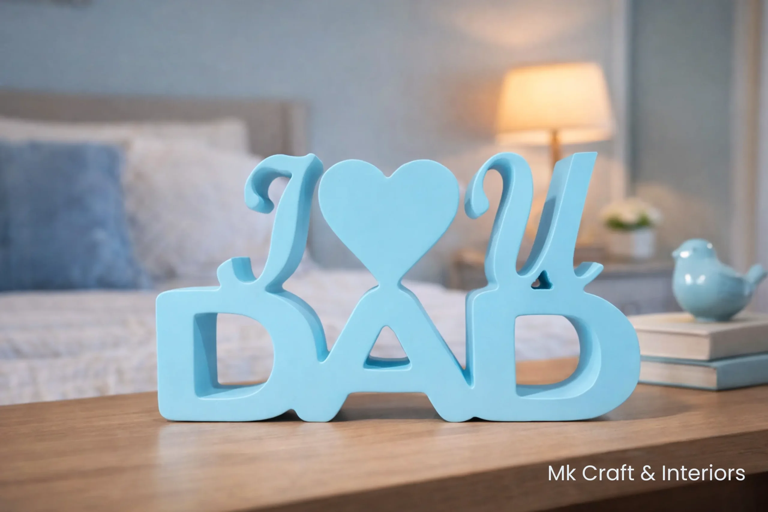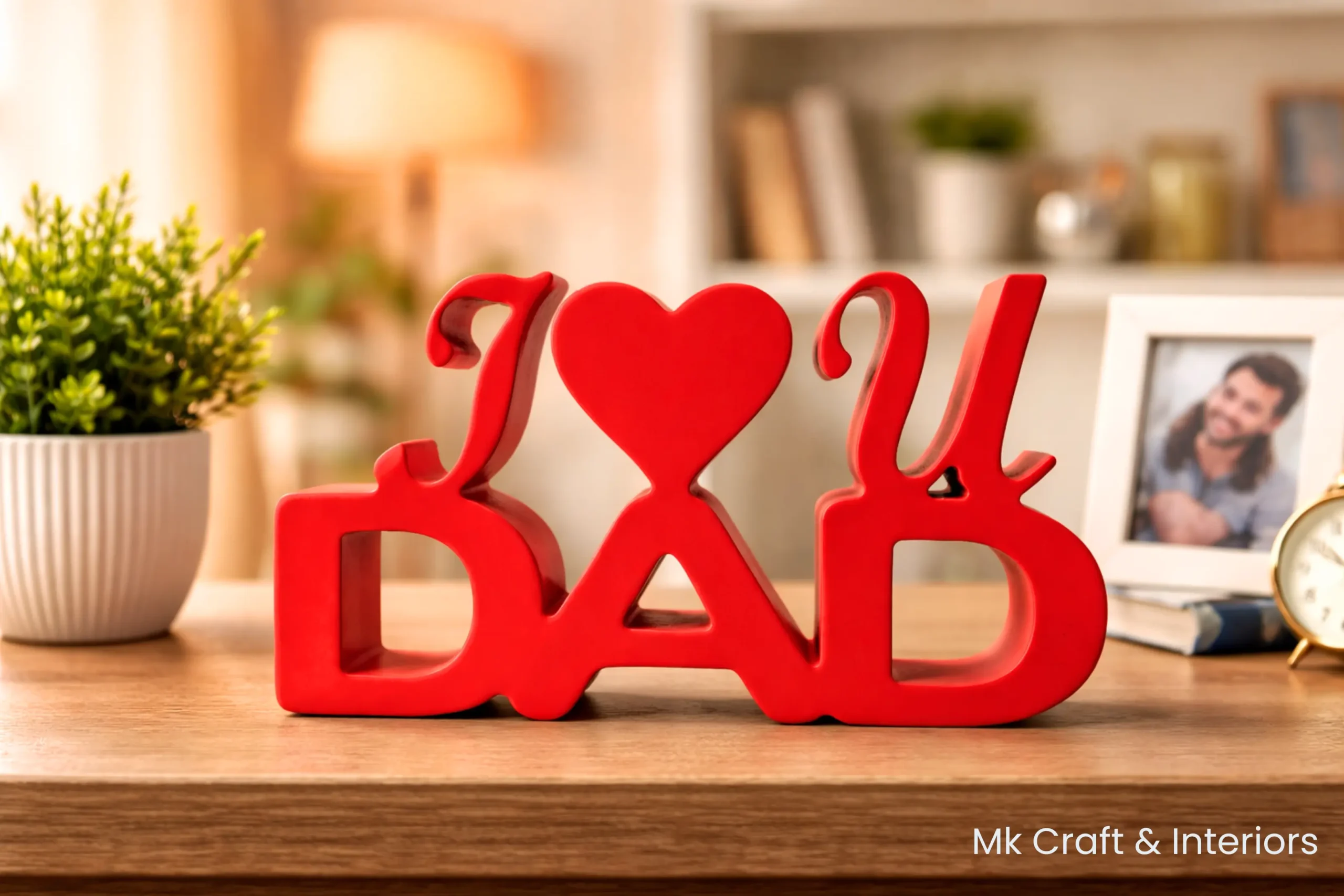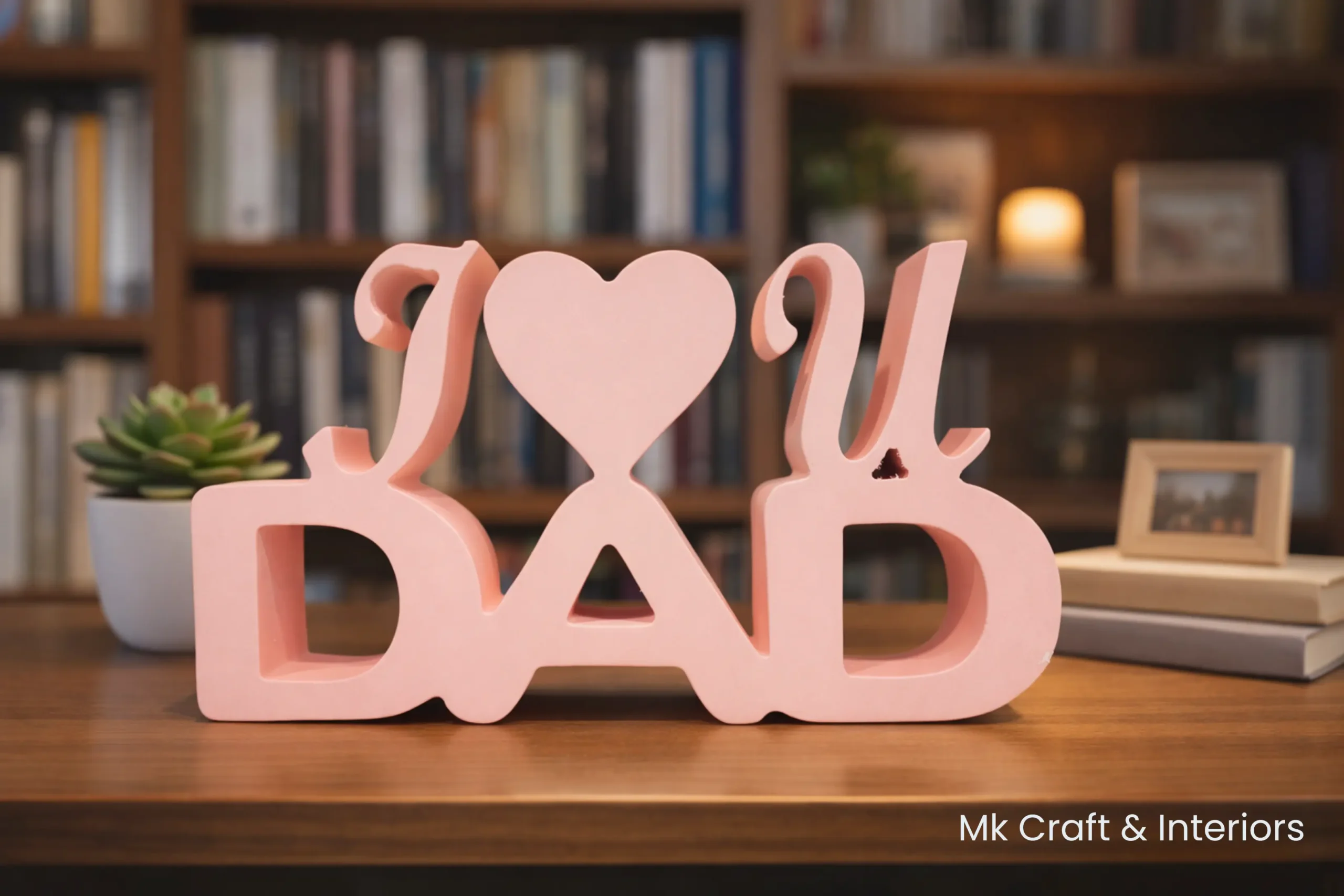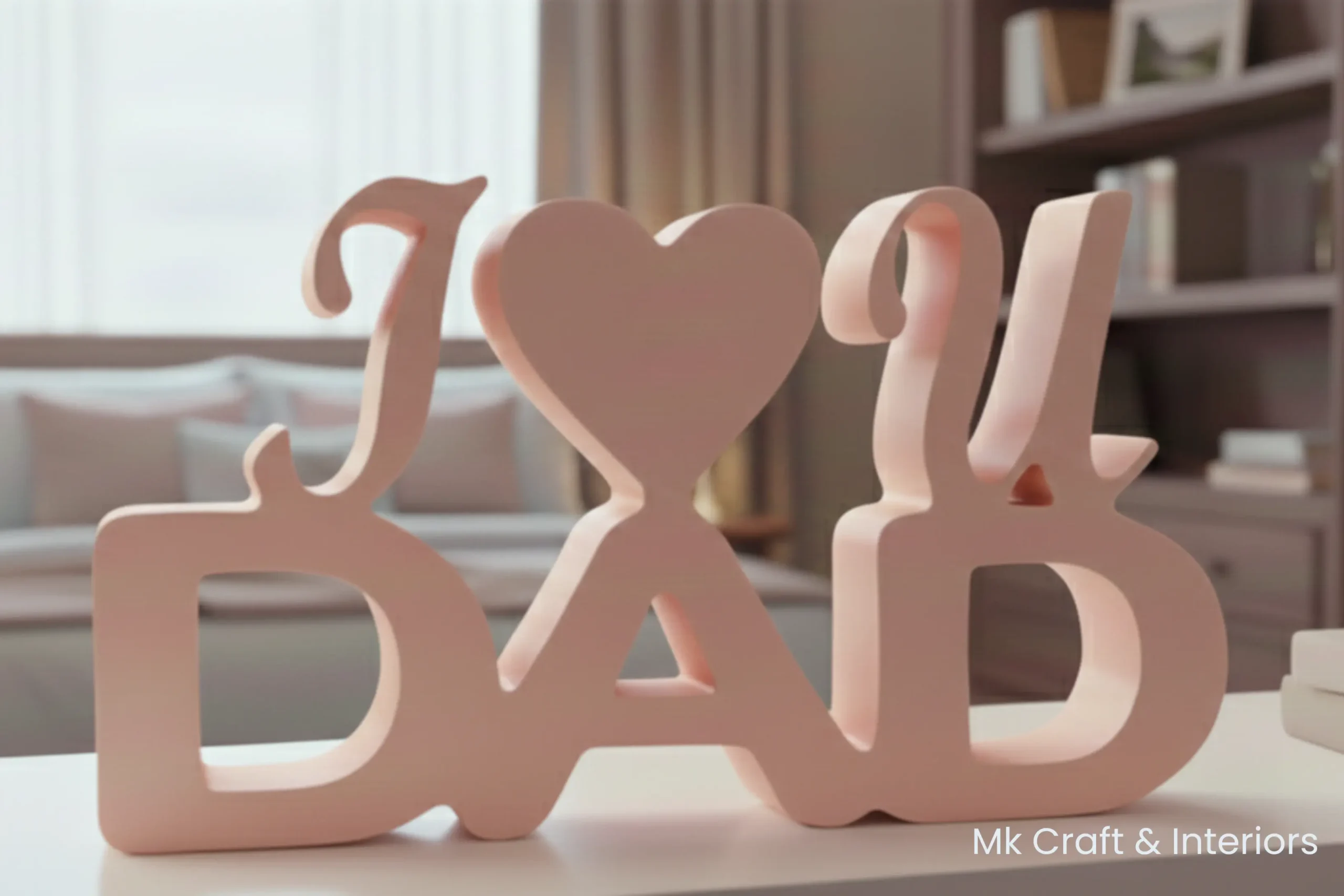 Light pink wooden “I Love You Dad” showpiece with heart design by MK Crafts placed on a table – handcrafted gift for father.I Love You DAD