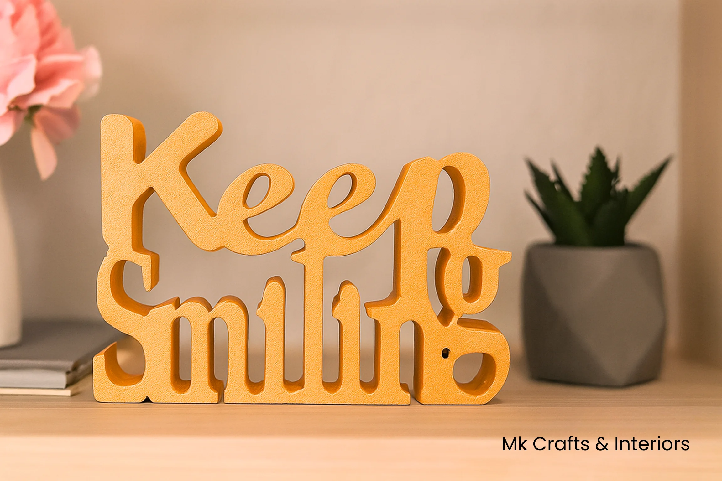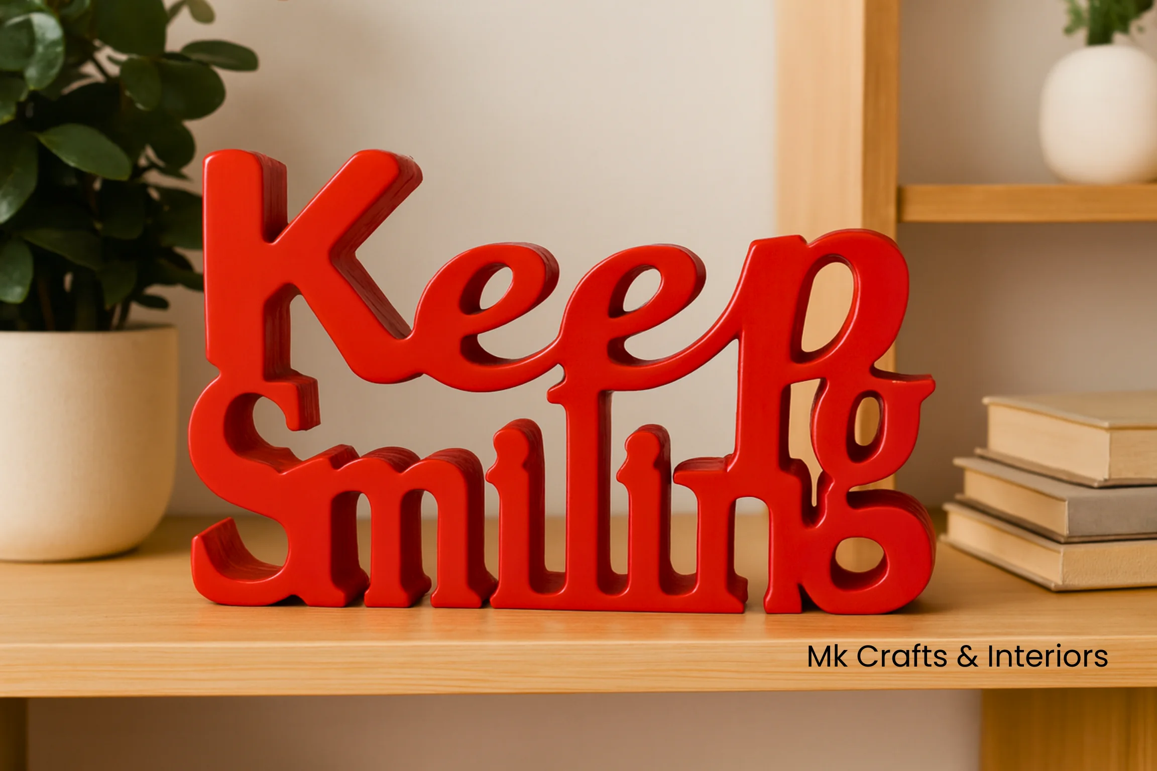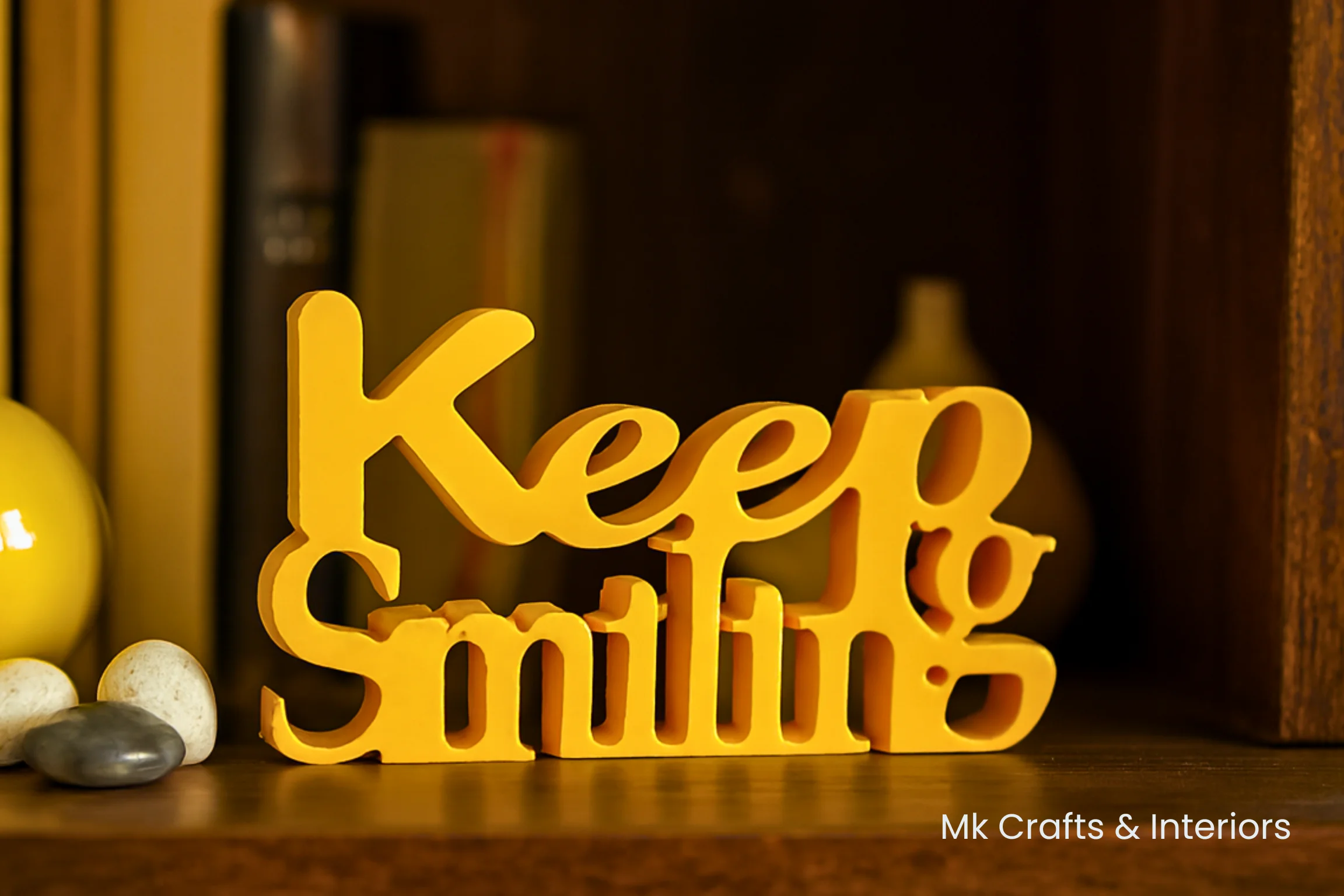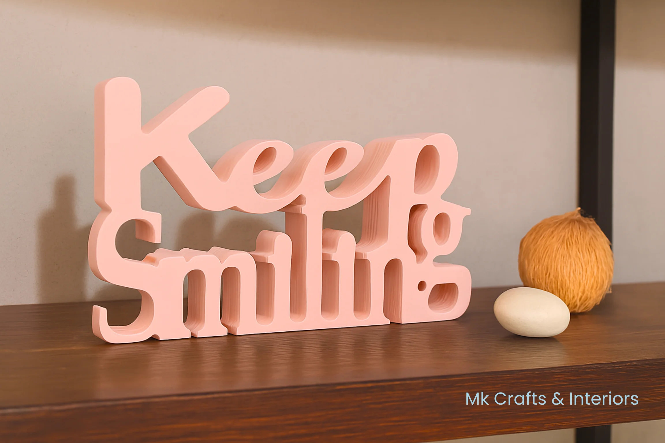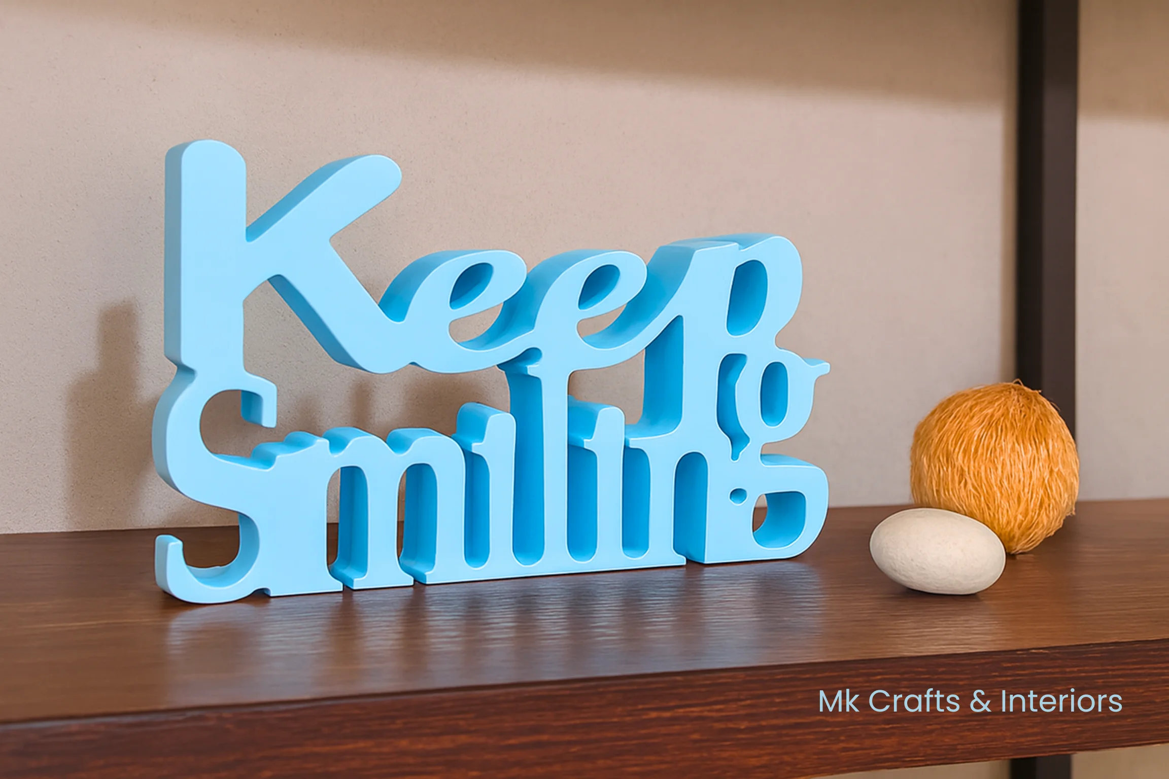 Light blue “Keep Smiling” wooden decorative showpiece by MK Crafts & Interiors in Hyderabad placed on shelf – motivational home décor gift.Keep Smiling